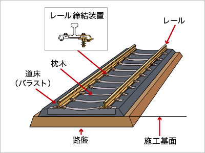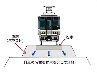 線路とは、「バラスト(レールや枕木を支え、クッションの役割を果たす)」と、「枕木(列車の荷重を効率よくバラストに伝える)」、そしてその上を列車が走る「レール」で構成されています。