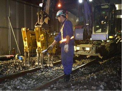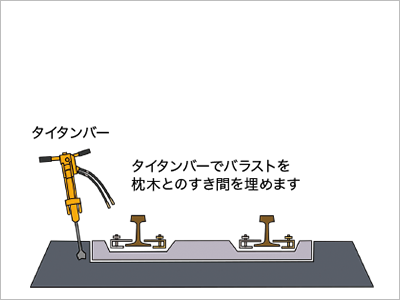 線路のゆがみを直すには、ミリ単位での精密な精度で整備を行っています。タイタンパーという器具や、軌陸バックホウを利用して、枕木下面の道床をつき固めることにより整備しています。