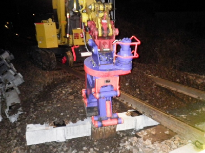 枕木は主にコンクリートや木でできています。レールから伝わる列車の重さや振動を支えていることで劣化するため、定期的な交換が必要となります。交換は、枕木をつかむ専用アタッチメントを取り付けたバックホウを使用して作業を行い、技能者による細やかな技術で仕上げていきます。
