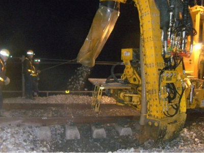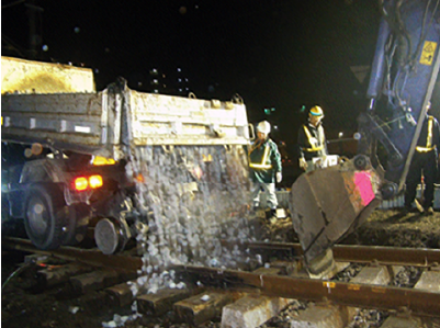 枕木を支え、列車通過時の荷重や衝撃を分散させる役目を持つ線路の敷石「道床バラスト」の交換は線路保守において重要な工事のひとつです。軌陸バックホウや軌陸ダンプを用いたオーソドックスな施工方法に加え、山陽新幹線では大型専用機械(バラスト作業車:NBS)を用いた施工も行っています。