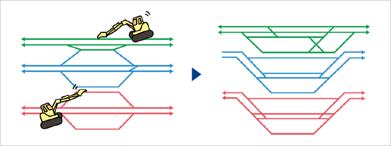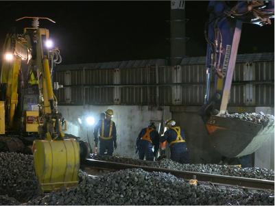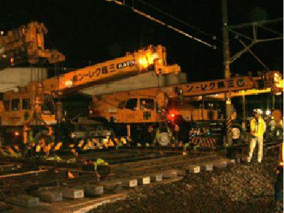 「単線区間の複線化」や「駅への乗り入れに伴う大規模配線変更」などにより新たに線路をつくることや、これまでの線路につなげるなど、街に新たな線路をつなげる線路切替工事を行っています。大型のクレーンや軌陸バックホウを何台も使用して行うため、時には数百人規模になる場合もあります。