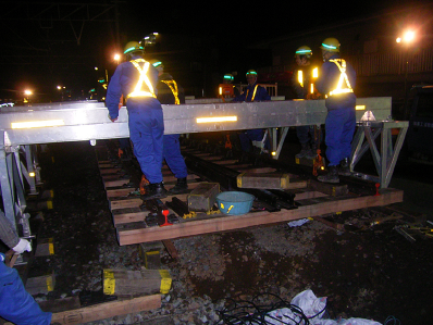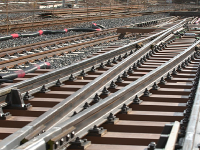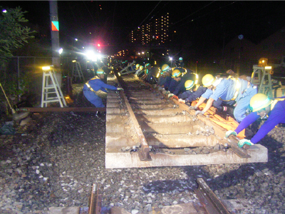 分岐器とは、一つの線路を二つ以上の線路に分けるための線路のこと。たとえば、新たな線路を駅に引込むためには新たに分岐器を設置する必要があり、そのためあらかじめ組み立てた分岐器をわずか数時間で設置します。時には数百人規模になる場合もあります。