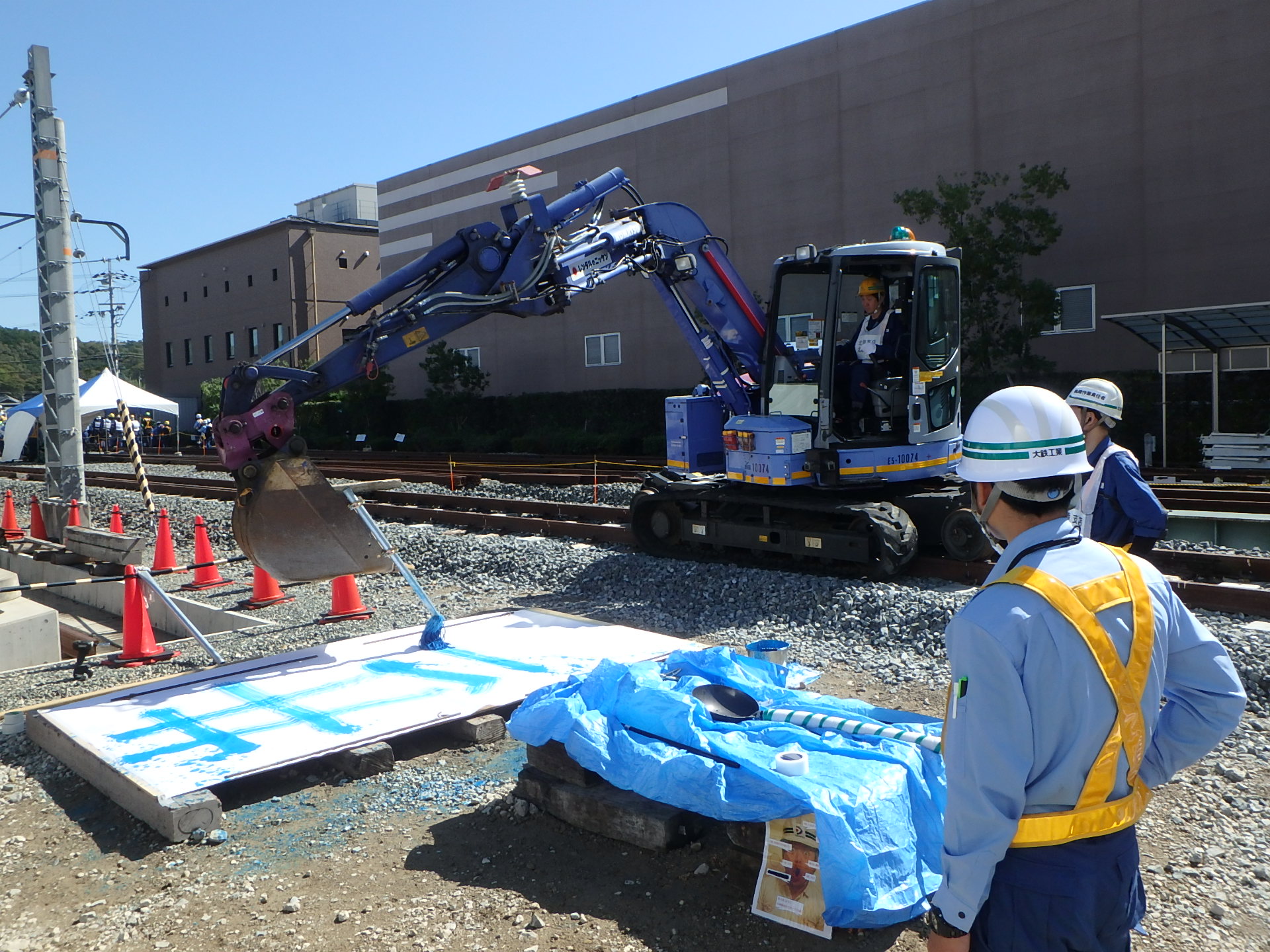 軌陸BH(PC78)を使用し、先端に取り付けた筆で用紙に「井手」と書き入れる作業、施工基面に仮置きした円柱を挿入口に挿入する作業、仮設プール内のカラーボールをザルで掬い投入口に投入する作業など、計4種の競技を通じて操作性の習熟度を競いました。