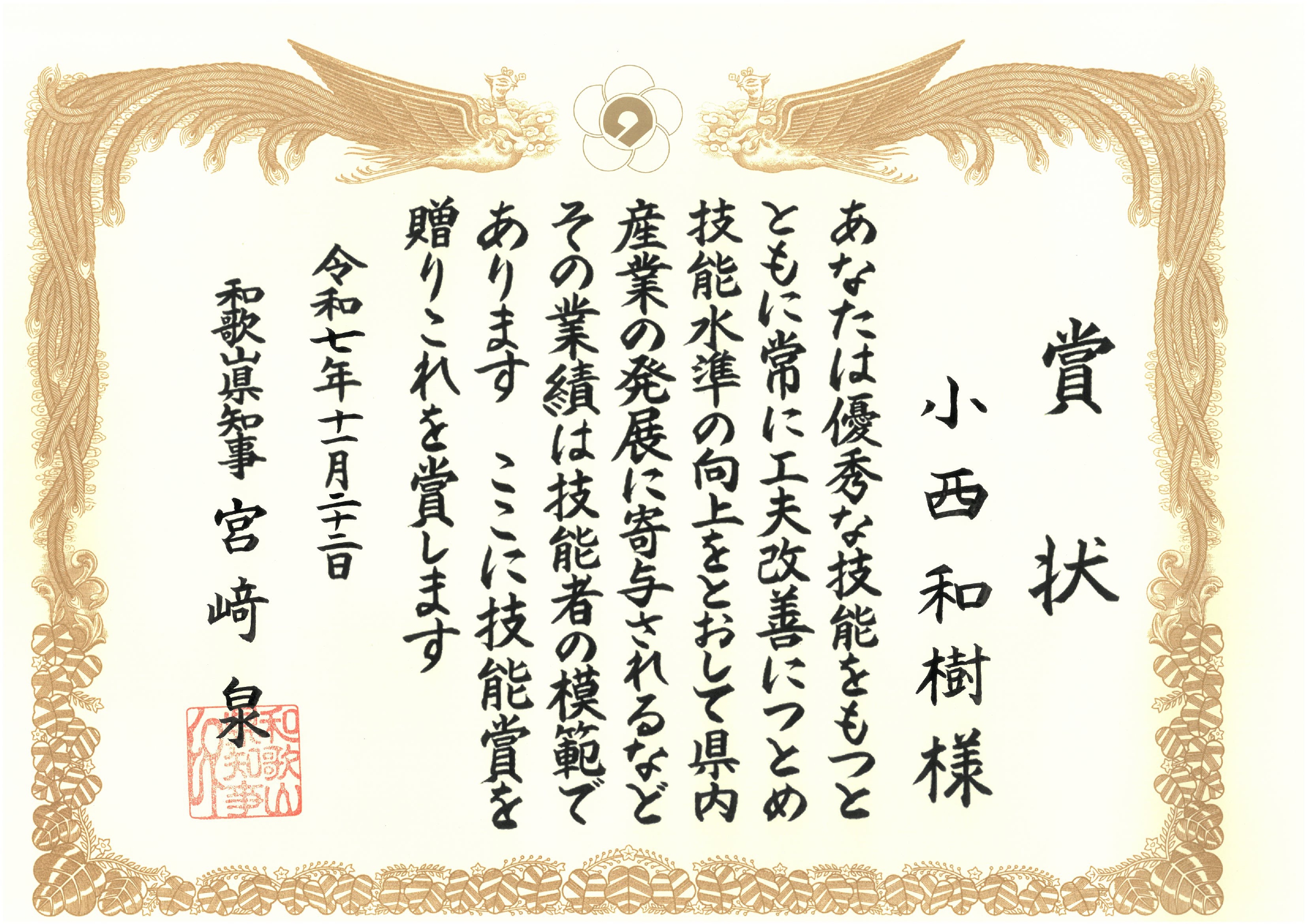 「和歌山県技能賞」は、県内の優れた技能者を表彰することで、広く一般に技能を尊重する気運を高め、県内技能者の地位向上と技能の発展を図ることを目的とした制度です。対象となるのは、15年以上の実務経験を持ち、卓越した技能を有する方です。